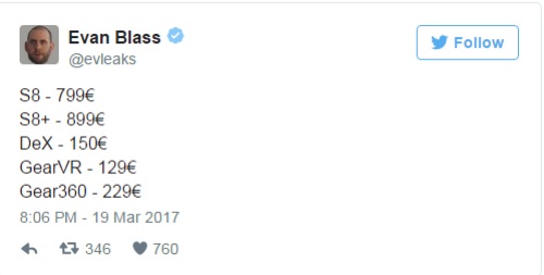 Theo nguồn tin này, Galaxy S8 và Galaxy S8 Plus sẽ có 3 tùy chọn màu duy nhất: Đen Sky, Xám Orchid và Bạc Arctic. Ngoài ra, tài khoản Twitter cá nhân Evan Blass cũng hé lộ giá bán của cặp smartphone trên tại thị trường châu Âu.