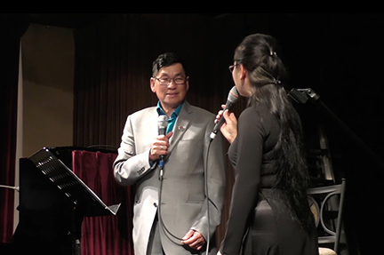 Ông Đào Duy Anh đang được cô Kim Ngân giới thiệu lên hát bài “Sài Gòn Mưa Cuối Mùa” tại Viện Việt Học ở Westminster vào đêm thứ Bảy. Qua ngày hôm sau ông cùng vợ bay về Kentucky và gặp bạo lực trên chuyến bay của United Airlines tại Chicago.(Hình lấy từ video do Doc Nguyen đưa lên YouTube)
