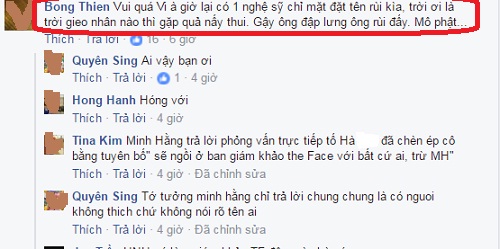 Trước đó, chiều qua (19.4), Minh Hằng khóc và chia sẻ lý do cô từ chối nhận lời đảm nhận vai trò huấn luyện viên chương trình The Face 2017. Khi được hỏi có phải Hồ Ngọc Hà là người gây áp lực với ban tổ chức để Minh Hằng vắng bóng tại Gương mặt thương hiệu mùa 2, Minh Hằng đã bật khóc khi nói: "Đó là người mà Hằng không muốn nhắc đến".