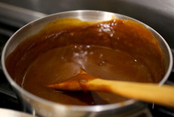 - Thêm nước vào khuấy tới khi bột cà ri tan hết, cho sốt cà chua vào khuấy đều 8-10 phút tới khi nước sốt sánh lại thì tắt bếp.