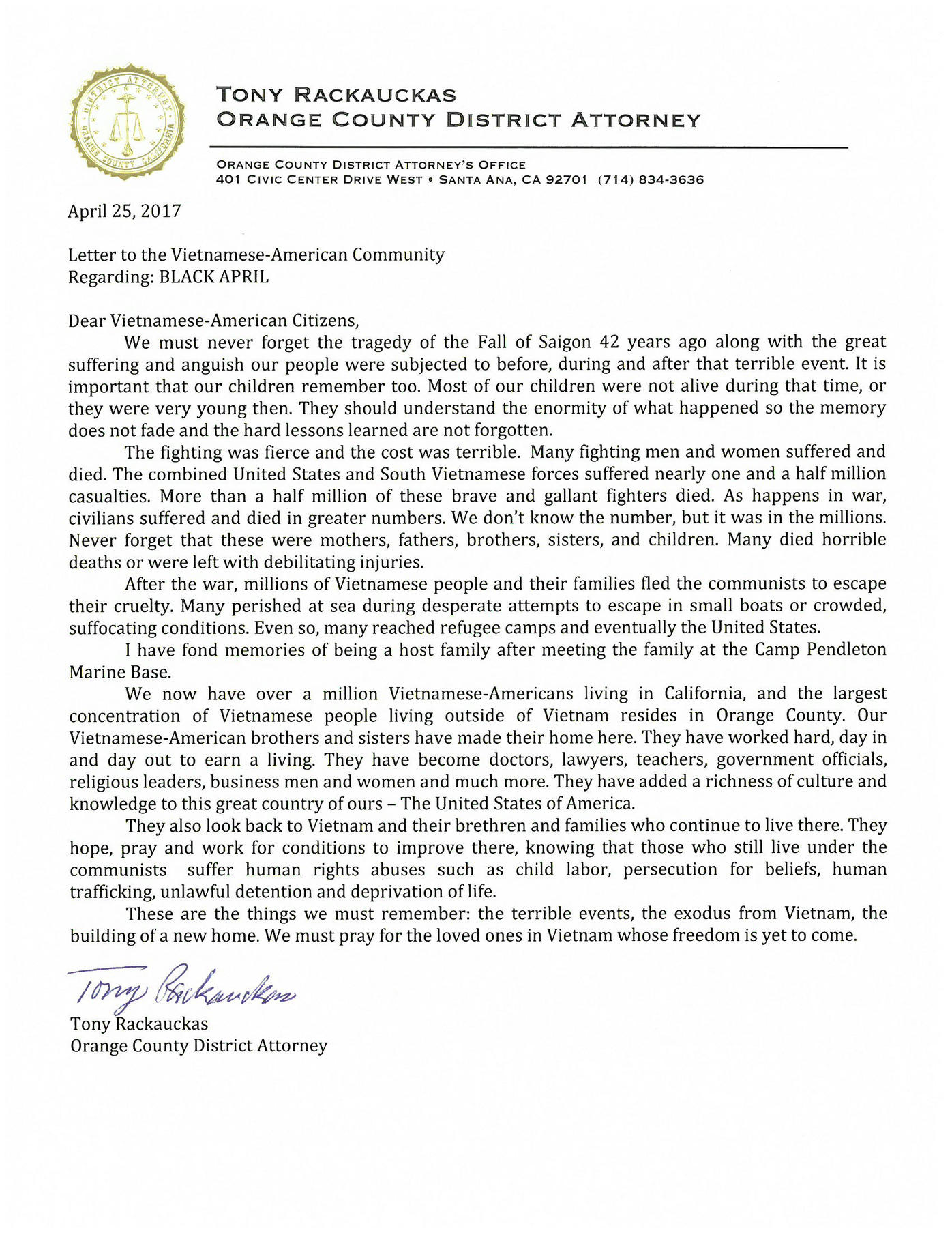 WESTMINSTER – Vào ngày thứ Tư, văn phòng của Chánh Biện Lý Quận Cam, ông Tony Rackauckas, đã gởi một lá thư dài, khá đặc biệt đến cộng đồng người Mỹ gốc Việt sống tại Quận Cam, để tưởng niệm Ngày Quốc Hận 30 Tháng Tư mà cộng đồng người Việt tị nạn trên khắp thế giới đều ghi nhớ. Trong thư, Chánh Biện Lý Quận Cam đã nhắc đến những thảm kịch mà người Việt Nam đã phải trải qua sau năm 1975, tình trạng chà đạp nhân quyền tại Việt Nam, và sự phấn đấu để thành công của cộng đồng người Việt tại hải ngoại.
