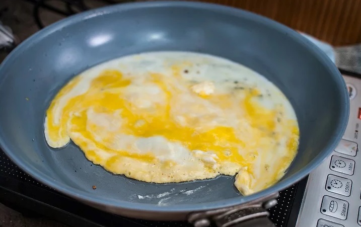 - Làm nóng dầu trong chảo, đánh tan trứng rồi đổ vào chiên chín 2 mặt.