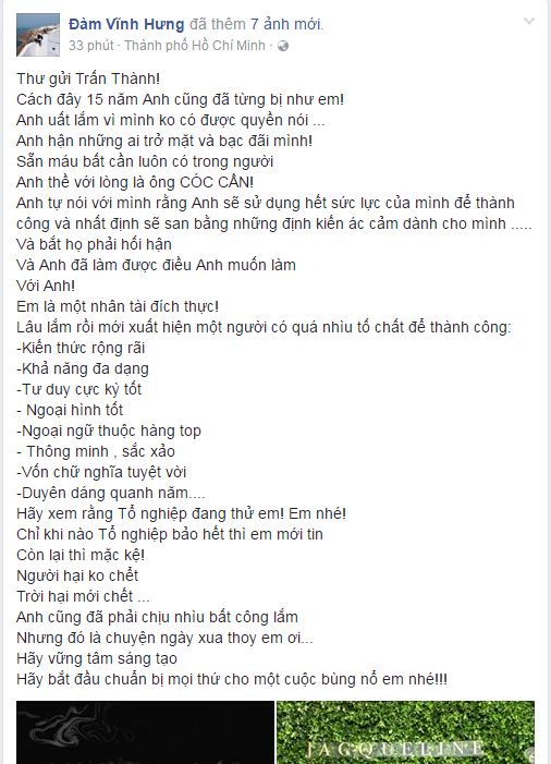 Nam ca sĩ Đàm Vĩnh Hưng đã bất ngờ lên tiếng bênh vực Trấn Thành. Theo đó anh cho rằng Trấn Thành là một nghệ sĩ có tài, và điều Trấn Thành nên làm bây giờ là vững tâm tiếp tục con đường nghệ thuật mà mình đã chọn, với những phẩm chất của Trấn Thành, hãy là cho những người "dìm" anh phải hối tiếc.
