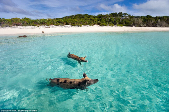 Đảo lợn: Trên hòn đảo hoang ở vùng Exuma của Bahamas, những con lợn hoang tự do bơi lội dưới biển. Du khách có thể tới đây bằng thuyền và chơi đùa với chúng,Theo truyền thuyết, các thủy thủ đã thả những con lợn lên đảo với ý định sẽ quay lại để giết thịt chúng, nhưng họ đã không bao giờ quay lại.