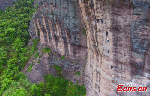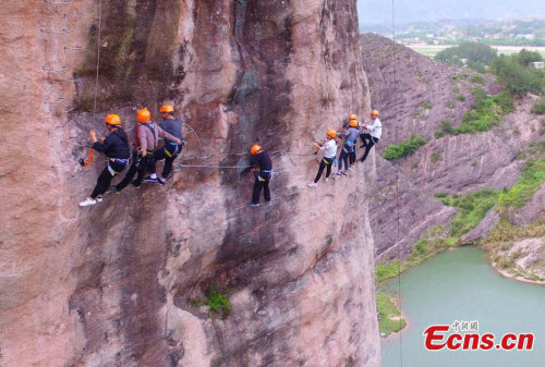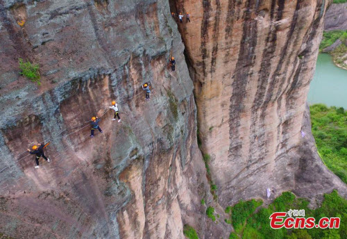 Tuyến đường “tử thần” Via Ferrata mới được mở cửa gần đây dành cho những du khách đam mê mạo hiểm trong Công viên địa chất quốc gia Shiniuzhai ở tỉnh Hồ Nam, Trung Quốc.