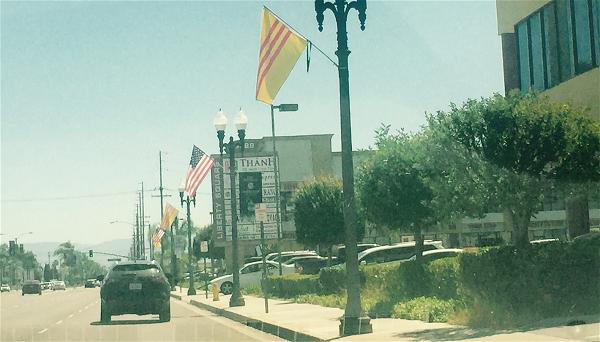Ở ngã tư Brookhurst và Bolsa, vài khách bộ hành bước vội dưới hàng cờ vàng sọc đỏ trịnh trọng treo trên những cột điện hai bên đường.