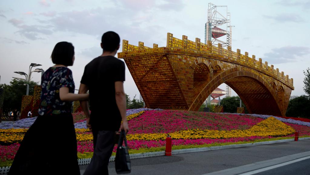 Công trình nghệ thuât ''Cầu Vàng trên Đường Tơ Lụa' của nghệ sĩ Shu Yong, mừng thượng đỉnh tại Bắc Kinh, về đề án Một Vành Đai Một Con Đường - OBOR. Ảnh ngày 10/05/2017. Reuters