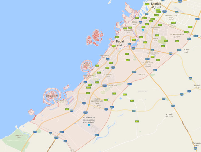 Dubai (khu vực khoanh đỏ trên bản đồ) nổi tiếng với nhiều dự án táo bạo như các đảo nhân tạo, các tòa nhà chọc trời, đường trượt tuyết trong nhà ở vùng sa mạc. Ảnh: Google Maps.