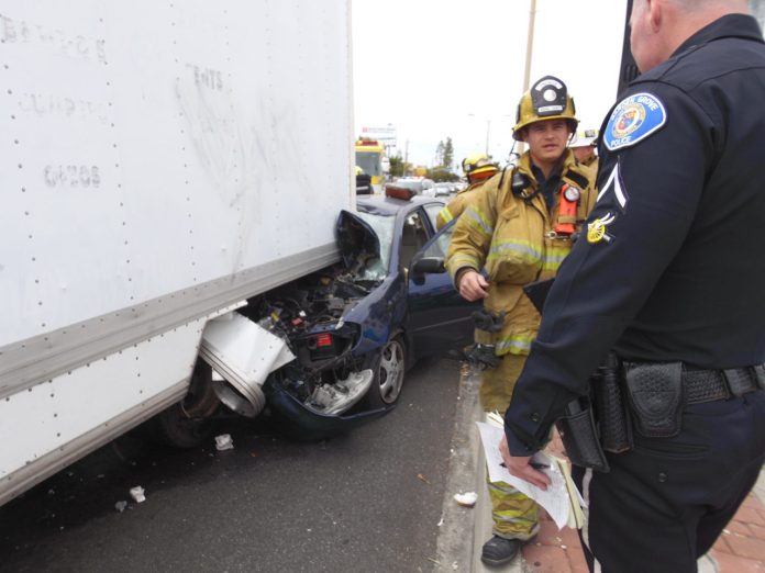 Chiếc Honda Accord màu đậm dẫn đầu chưa kịp quẹo trái, kế đến là chiếc xe tải sáu bánh màu trắng, và sau cùng là chiếc Toyota Corolla màu xanh đậm, đầu xe này đụng chui sâu vào phía đuôi chiếc xe tải.