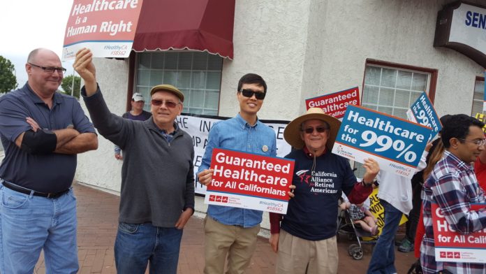 Một nhóm người, cả gốc Việt lẫn da trắng, tập trung trước cửa văn phòng Thượng Nghị Sĩ Janet Nguyễn tại Garden Grove và hô hào khẩu hiệu ủng hộ Dự Luật SB 562, một dự luật y tế toàn tiểu bang, lúc 12 giờ, Thứ Tư, 31 Tháng Năm, và kêu gọi vị nữ dân cử bỏ phiếu