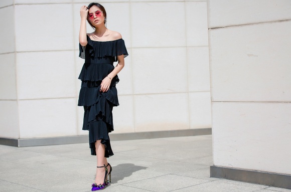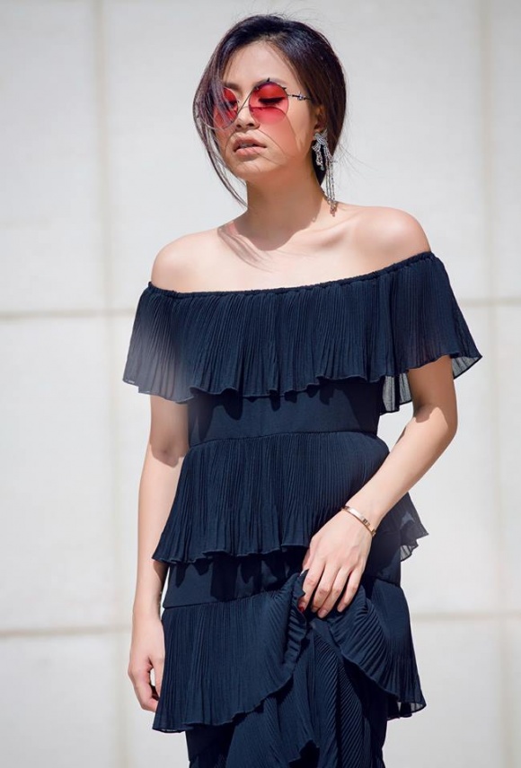 Old  Cool Thời trang đầm trễ vai gợi cảm của Hoàng Thuỳ Linh