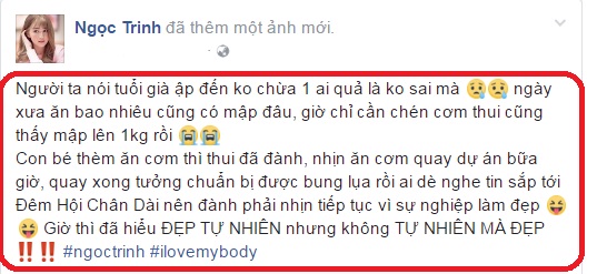 Đi kèm với hình ảnh này, "nữ hoàng nội y" có dòng chú thích gây ngỡ ngàng vì người đẹp vô tình tiết lộ cách để có vòng eo 56cm. "Người ta nói tuổi già ập đến không chừa 1 ai quả là không sai mà. Ngày xưa ăn bao nhiêu cũng có mập đâu, giờ chỉ cần chén cơm thôi cũng thấy mập lên 1kg rồi. Con bé thèm ăn cơm thì thôi đã đành, nhịn ăn cơm quay dự án bữa giờ, quay xong tưởng chuẩn bị được bung lụa rồi ai dè nghe tin sắp tới Đêm Hội chân dài nên đành phải nhịn tiếp tục vì sự nghiệp làm đẹp. Giờ thì đã hiểu ĐẸP TỰ NHIÊN nhưng không TỰ NHIÊN MÀ ĐẸP" - Ngọc Trinh viết.