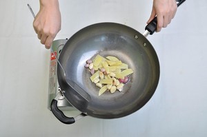 - Làm nóng dầu trong chảo, cho gừng, tỏi, hành khô vào phi thơm.