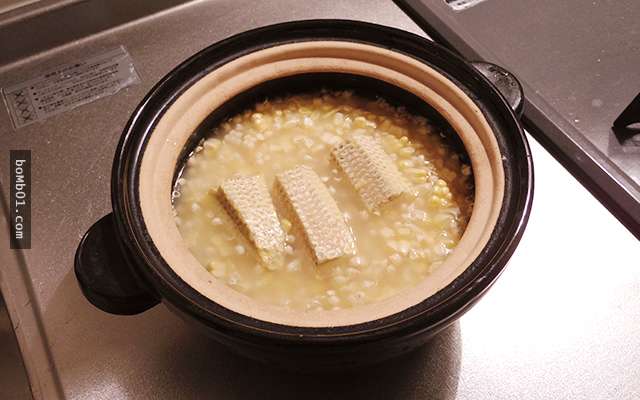 ▼ Cách nấu cũng không phức tạp, đầu tiên vo sạch gạo sau đó đem ngâm cùng một ít nước trong khoảng 1 giờ. Trộn hạt ngô đã được tách ra, thêm một chút muối và lượng nước vừa đủ. Cuối cùng bỏ lõi hay cùi ngô vào trong đó và bắc lên bếp. Mục đích của việc bỏ cùi ngô vào nước là để tăng mùi vị thơm và ngọt cho cơm.