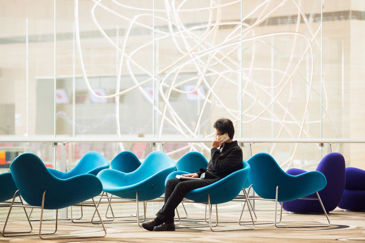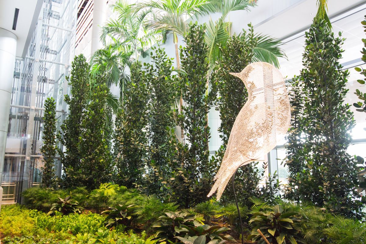 Một tác phẩm nghệ thuật mang tên "Les Oiseaux" (Chú chim) bằng thép không gỉ đặt trong khu vực phòng chờ đến