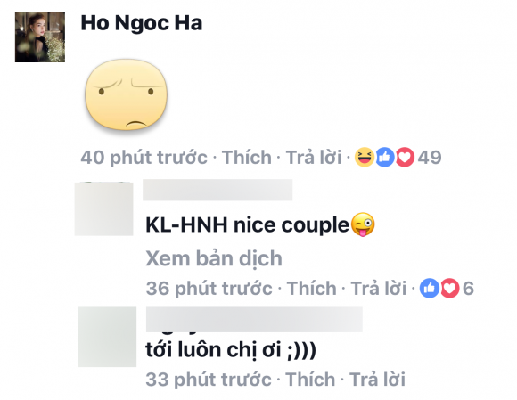 Mới đây, Kim Lý vừa treo status đầy tình cảm: "Missing you". Ngay lập tức Hà Hồ là người bình luận đầu tiên. Cô không viết bằng chữ mà để một biểu tượng nhíu mày cực dễ thương. Nhiều fan khác vào hỏi thẳng Kim Lý có phải anh đang nhớ Hà Hồ hay không thì anh không ngại ngần hay giấu diếm, lập tức thả tim thay cho câu trả lời. Một số khác tiếp tục ủng hộ Kim Lý và Hà Hồ nên duyên vì họ quá đẹp đôi.