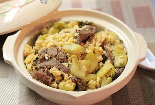 - Bước 5: Cuối cùng cho bát thịt bò và dưa cải ở bước 6 vào chảo cơm, dùng muôi trộn nhẹ, nêm nếm lại gia vị tùy theo sở thích của bạn, thêm hành lá thái nhỏ vào. Tắt bếp, múc cơm ra bát dùng nóng, nếu nhạt có thể thêm dùng kèm với xì dầu pha tỏi.