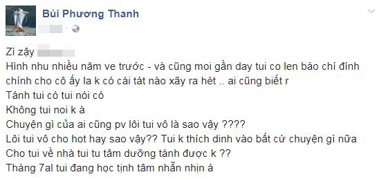 Mới đây, Phương Thanh lên tiếng phân trần khi đọc được thông tin cô thay Thu Phương (vợ cũ của Huy MC) tát Hồ Ngọc Hà để răn đe. Giọng ca "Trống vắng" cho biết thông tin này là sai sự thật và cô không hề tát Hồ Ngọc Hà. Nữ ca sĩ bức xúc khi chuyện cũ bị "đào xới" lại dù trước đó cô đã lên tiếng đính chính.