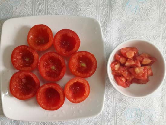 - Bước 3: Cà chua rửa sạch, cắt núm đầu, dùng thìa nạo phần ruột bên trong quả cà để vào 1 bát nhỏ dùng làm phần nước sốt.