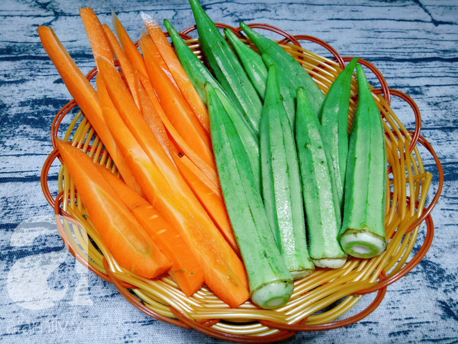 Đậu bắp rửa sạch, ngâm qua nước muối loãng, để ráo. Cà rốt gọt vỏ, rửa sạch, thái dài bằng quả đậu bắp. Cho ít nước vào nồi nấu sôi, thêm chút muối, sau đó cho các loại rau củ vào chần sơ với nước sôi rồi vớt ra để ráo.