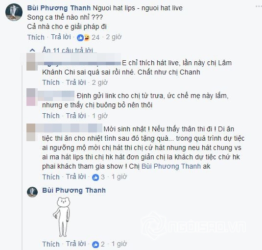 VBF-Vừa qua ca sĩ chuyển giới Lâm Khánh Chi hay Lâm Chi Khanh đã giới thiệu tự truyện. Với bao scandal trong đó như ám chỉ Đan Trường, rồi tình đơn phương với Ưng Hoàng Phúc. Nay nữ ca sĩ lại tố chị Chanh bỏ show và lần này ca sĩ Phương Thanh không để yên.