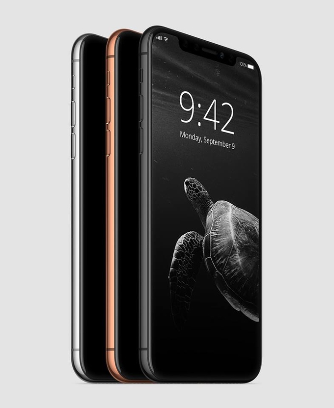 Hình ảnh được cho là iPhone X xuất hiện với ba màu là đen, vàng đồng và bạc. Cả ba đều có mặt trước màu đen hoàn toàn để tạo sự liền lạc với màn hình.