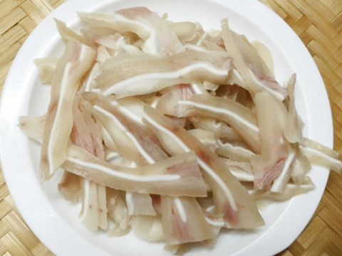 Pha nồi nước lạnh với chút giấm, rồi thả tai vào luộc chín, vớt ra bát.