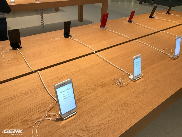 Phía bên trong cửa hàng, hoạt động kinh doanh vẫn diễn ra hoàn toàn bình thường. Các mẫu iPhone trưng bày vẫn đang là iPhone 7, 7 Plus hoặc SE. Theo như tôi nói chuyện với 1 Apple Genius, các mẫu iPhone mới sẽ chỉ được trưng bày vào thời điểm bán ra.