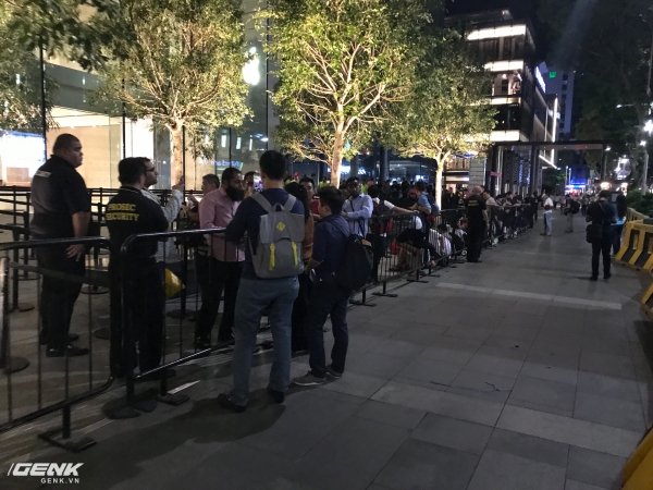 Vì xem Kingsman vào lúc 8h30 ngay gần đó, thời điểm film kết thúc là hơn 11 giờ đêm nên tôi đã tranh thủ tạt qua một lần nữa để xem tình hình xếp hàng ra sao. Lúc này, số người xếp hàng đã đông hơn, ngoài những người đã xếp vào hàng thì có một bộ phận đang túm tụm lại. Có vẻ như họ chưa hài lòng với vị trí xếp hàng của mình. Rất may chưa hề xảy ra tranh cãi nào. Ngoài ra, có thể thấy, Apple đã cực kì chuyên nghiệp khi kê rào chắn cũng như rất nhiều nhân viên bảo vệ để đảm bảo quá trình xếp hàng diễn ra một cách ổn định nhất
