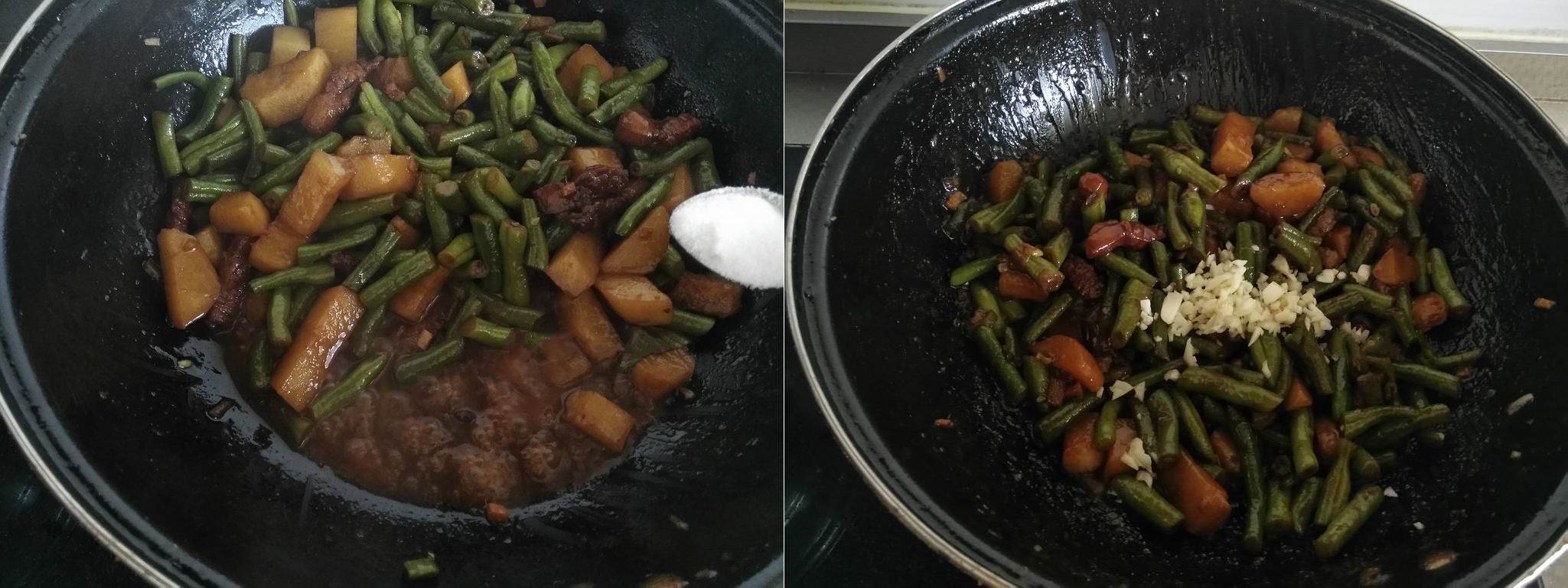 Thêm hành lá và nước tương vào chảo thịt đảo đều. Tiếp đó đổ đậu và khoai tây vào đảo chung.
