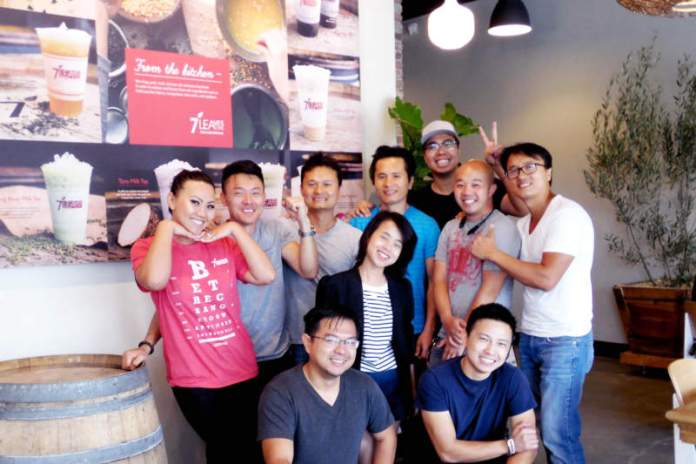 Các khuôn mặt trẻ sáng lập hệ thống “7Leaves Cafe.” Từ trái, Denny Ly, Hà Nguyễn, Quang Nguyễn, Việt Đỗ, Sơn Nguyễn, Josh Newsmaster và Vinh Nguyễn. (Hình: Linh Nguyễn/Người Việt