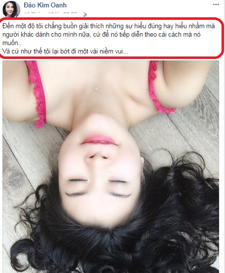Trong một dòng trạng thái khá dài mới đây, chị Hồng Nhung thẳng thắn "chỉ mặt đặt tên" Kim Oanh. "Ngay từ hồi bắt đầu xảy ra sự việc của tôi, bạn ấy cũng đã thấy nhiều lần nói xách mé tôi trên facebook. Tôi có chụp màn hình lưu lại để nhớ, nhưng tôi chưa nói lại một câu nào cả. Thế nhưng tôi không hiểu tại sao bạn ấy cứ hừng hực lên chửi tôi bằng những lời lẽ thậm tệ như thế, trong khi tôi chưa bao giờ đả động gì đến bạn ấy...Tôi cũng không hiểu chị ấy làm sao? Ghen với vợ chồng tôi à?