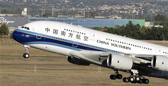 Một chiếc Airbus A380 được bán cho Trung Quốc đang cất cánh từ sân bay Toulouse-Blagnac hồi tháng 10/2014. Nguồn: Reuter