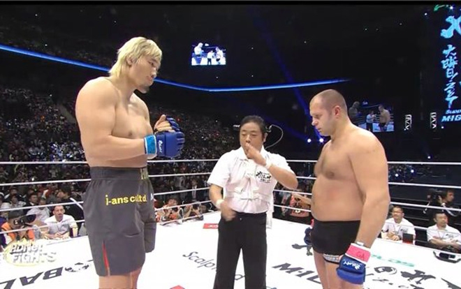 4 - Akebono Taro (trái) (Nhật Bản, 2m03, 250kg). Xuất thân là một võ sỹ sumo không ngạc nhiên khi Taro nặng tới 250kg. Do quá to lớn nên khi chuyển sang thi đấu đối kháng, võ sỹ 48 tuổi chỉ giành được duy nhất 1 trận thắng ở kickboxing (thua 9 trận) và toàn thua khi 4 lần lên sàn đấu MMA. Dù sao ông vẫn được biết tới như tay đấm sở hữu ngoại hình như người khổng lồ