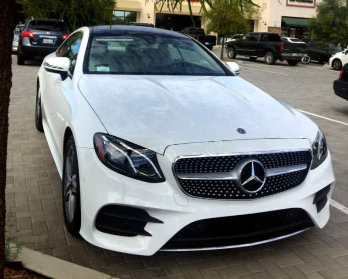 Chiếc Mercedes E400 , 2017 màu trắng sang trọng quý phái có giá trị khoảng 70 ngàn đô la trong khu thương mại trên đường Bolsa.