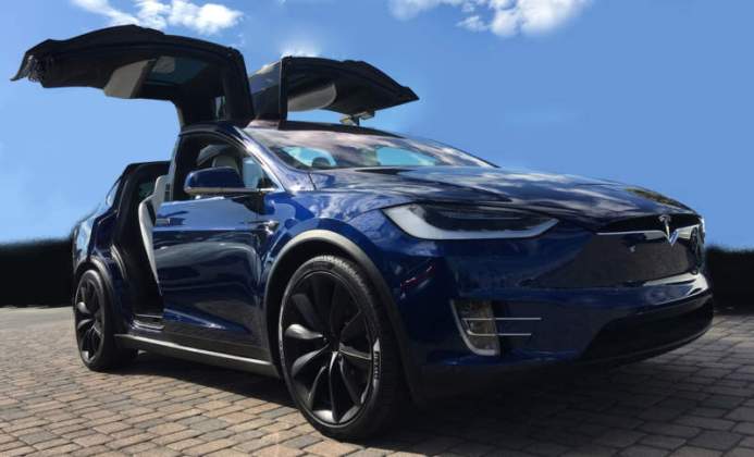 Chiếc xe Tesla X 90D đời 2017 với dáng vẻ sport tuyệt đẹp , hai cánh cửa mở vươn lên thật oai vệ chỉ có một chiếc duy nhất tại OC.Autohaus ở Nam Cali.