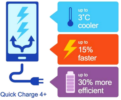 Một thiết bị di động muốn đạt chứng nhận Quick Charge 4+ cần hội tụ đủ cả ba yếu tố: Dual Charge, gồm một IC quản lư điện năng riêng (bên cạnh IC được tích hợp sẵn) làm nhiệm vụ chia sẻ ḍng điện ổn định, khả năng tản nhiệt và giảm thời gian sạc; Intelligent Thermal Balancing hỗ trợ Dual Charge tự động phân phối năng lượng một cách tối ưu nhất nhưng vẫn đảm bảo nhiệt độ thấp nhất; Advanced Safety Features để theo dơi các mức nhiệt độ kết nối đồng thời, tạo lớp bảo vệ chống lại hiện tượng quá nóng và ngắn mạch hoặc khi đầu Type-C gặp sự cố.