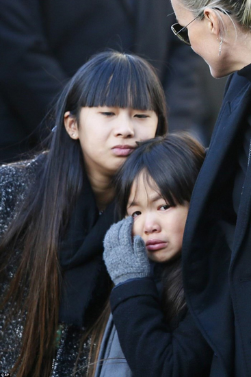 Hai con gái nuôi gốc Việt trong đám tang của Johnny Hallyday hôm 9/12 tại Paris, Pháp. Jade năm nay 13 tuổi còn Joy chín tuổi. Johnny Hallyday cũng có hai con ruột - David (51 tuổi) và Laura Smet (34 tuổi).