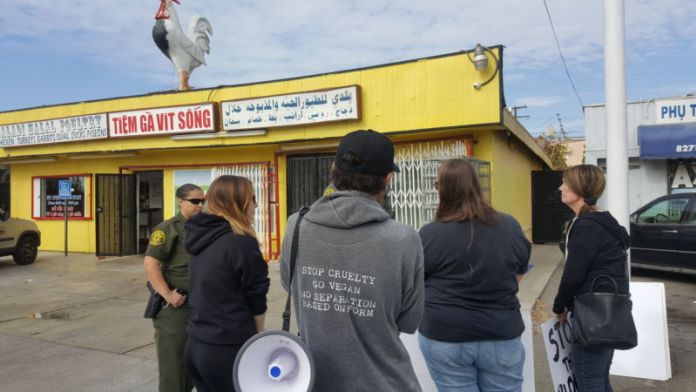 MIDWAY CITY, California (NV) – The Save Moment ở Orange County, thuộc tổ chức bảo vệ động vật OC Animal Save, có cuộc biểu tình ngay trước tiệm bán gà, vịt sống Baladi Halal Poultry, một trong những nơi bán gà, vịt sống nổi tiếng ở Little Saigon, để phản đối việc giết và bán động vật, vào lúc 1 giờ chiều, 31 Tháng Mười Hai, 2017.