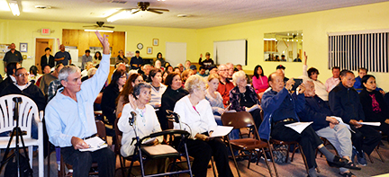 Các cư dân tham dự buổi họp và nêu ý kiến vào chiều thứ Tư, ngày 17 tháng 1, 2018 tại khu nhà Green Lantern Mobile Home Park ở đường Beach Blvd., gần Tòa Thị Chánh Westminster. (Thanh Phong/ Viễn Đông)