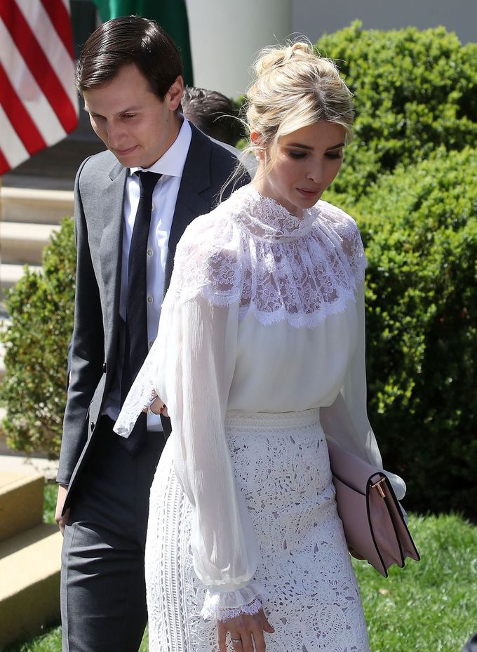 Trong dịp tiếp đón Vua Abdullah II và Hoàng hậu Rania nước Jordan tới Nhà Trắng hồi tháng 4/2017, Ivanka diện đầm ren trắng của Oscar De La Renta.
