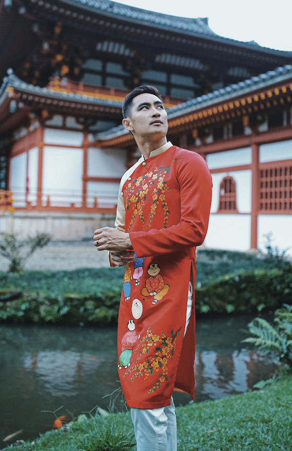 Hồ Vĩnh Khoa và bạn đời rất vui khi được người mẫu Ngọc Quyên cùng nhà thiết kế Phương Nguyễn tặng một số mẫu áo dài uyên ương dành cho nam để chuẩn bị đón Tết cổ truyền.