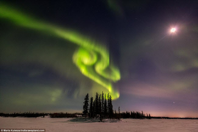 Ánh sáng bắc cực quang cuộn xoáy trên bầu trời tại thành phố Yellowknife, Canada.