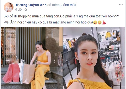 Chưa dừng lại ở đó, Trương Quỳnh Anh còn chia sẻ thêm khoảnh khắc cô diện đầm lệch vai gợi cảm, đi mua sắm cùng con trai. Theo đó, nữ diễn viên bày tỏ, "8/3, cô đi shopping mua quà tặng con. Có phải là 1 người mẹ quá tuyệt vời không? Anh nói chiều nay có quà bí mật tặng mình, hồi hộp quá".