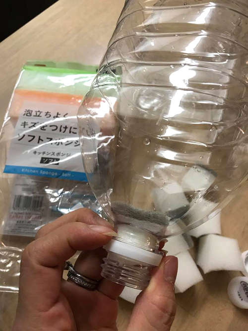 - Bình đựng cây chỉ cần đục lỗ hai bên để cho móc treo vào, cắt nhỏ miếng mút rửa chén lắp vào đầu chai để lọc nước/cát. Sau đó đổ vào ít đá/sỏi để thoát nước, cho đất lên và cây mầm/hạt đã gieo vào.