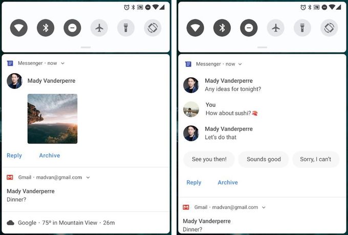 Android đang đi đầu trong việc xử lý thông báo và với Android P, khoảng cách mà nó tạo ra so với iOS càng được nới rộng. Chẳng hạn ngay trên thanh thông báo, Google sẽ đưa ra gợi ý nhanh để người dùng có thể trả lời nhanh.