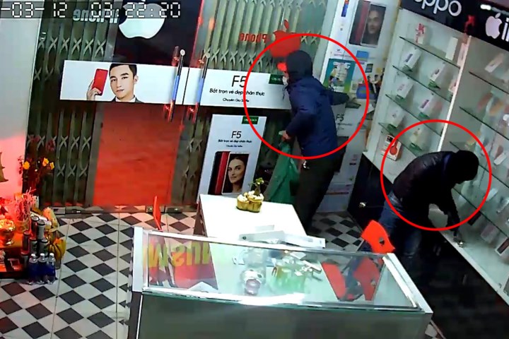 Vụ việc xảy ra lúc 3h20 ngày 12/3, tại một cửa hàng điện thoại ở thôn Xuân Dục, xã Tân Minh, huyện Sóc Sơn, Hà Nội. Facebook Huu Minh, chủ cửa hàng đã đăng tải camera ghi lại vụ việc và nhờ cộng đồng truy tìm hai tên trộm. Theo đó, vào đêm xảy ra vụ việc, vợ chồng chủ tiệm đang lái xe trên đường từ Hà Tây về thì nhận được chuông báo động camera. Mở ra xem liền phát hiện chúng đang vơ vét đồ bỏ vào bao tải. Ngay lúc này, anh đã gọi điện cho người thân đến và ngăn cản kịp thời.