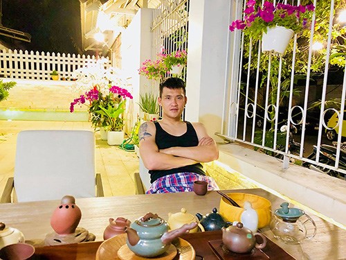 Công Vinh mặc trang phục ở nhà, trông anh khá thoải mái.