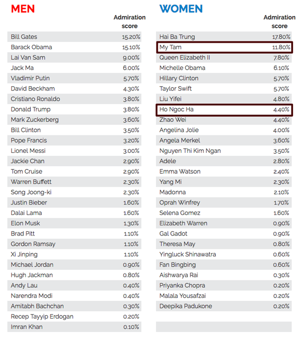 Trang YouGov của Anh vừa công bố kết quả khảo sát những nhân vật được ngưỡng một nhất thế giới năm 2018. Trong bảng xếp hạng này có 20 nhân vật nam và 20 nhân vật nữ được. Trong đó Mỹ Tâm và Hồ Ngọc Hà nằm trong top 10.