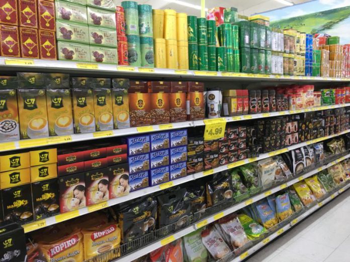 Trà, cà phê Việt trên kệ hàng ở Green Farm Market. (Hình: Trúc Linh/NV)